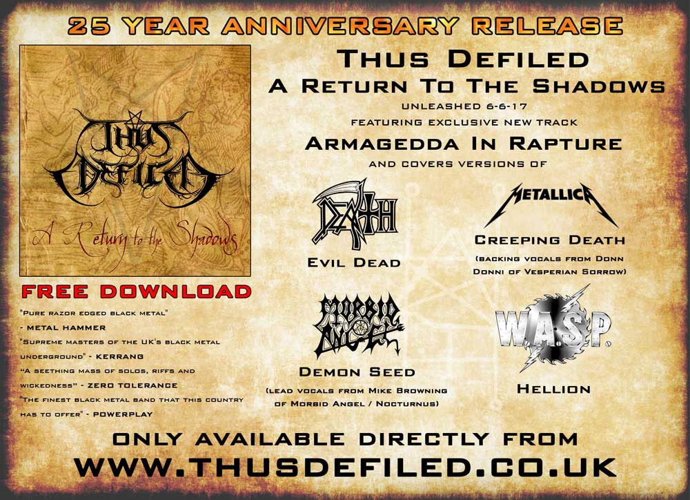 To mark 25 years of Thus Defiled, we have a new EP "A Return To The Shadows" that will be available for free download featuring a new song and 4 covers. Mike Browning of Morbid Angel/Nocturnus joined us to provide vocals for our Morbid Angel cover of Demon Seed. For the music, story behind the release, how we chose the cover versions and why we hope some of you will make a donation to a worthwhile charity click the link below. This recording is respectfully dedicated to: Chuck Schuldiner (Death), Cliff Burton (Metallica) and Grant Saunders (Thus Defiled).Free Download